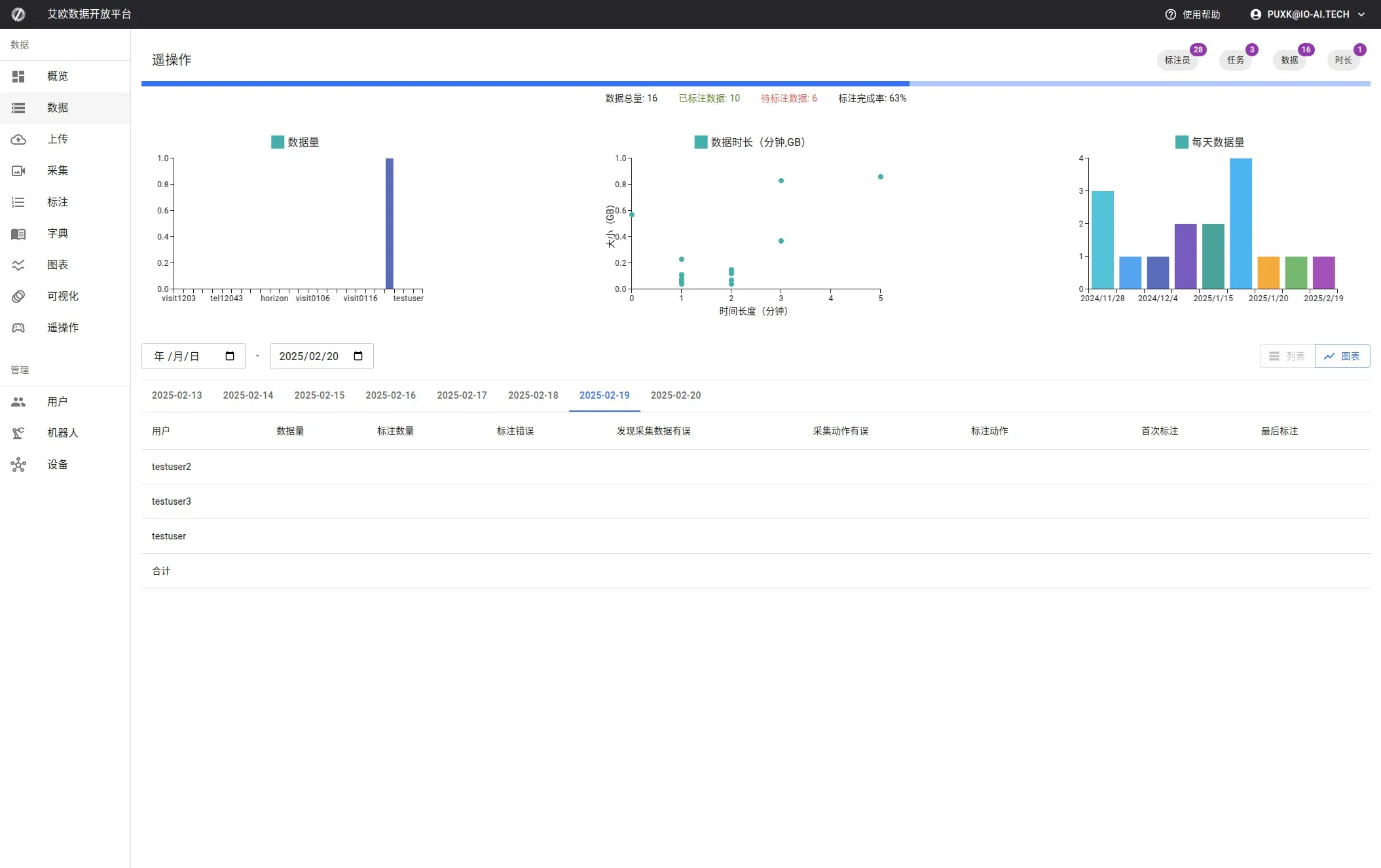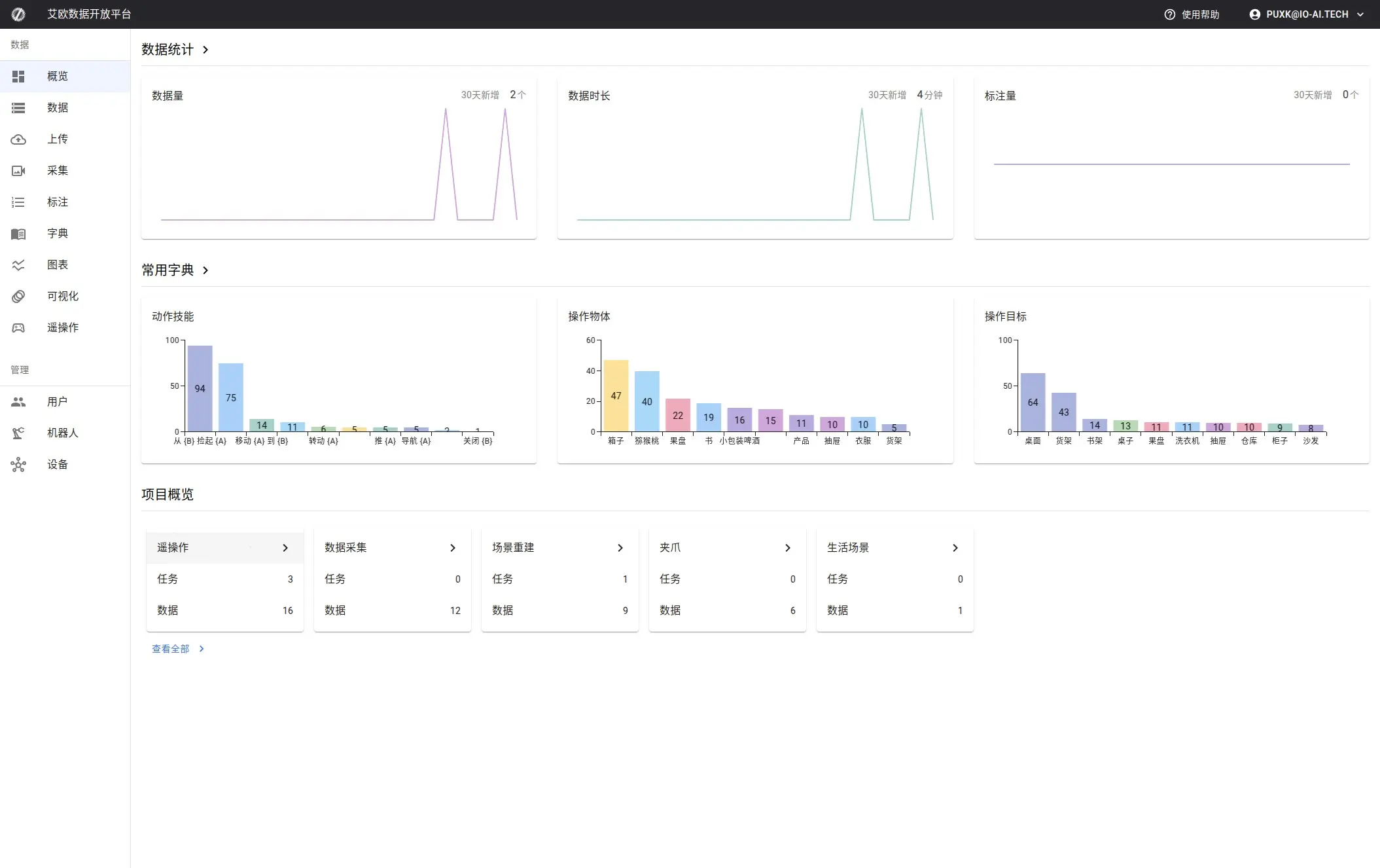 Here, you can view integrated data statistics, common dictionary statistics, total annotation time statistics, and the work progress of each person in the current project. These statistics help you understand the project's progress and data distribution comprehensively.