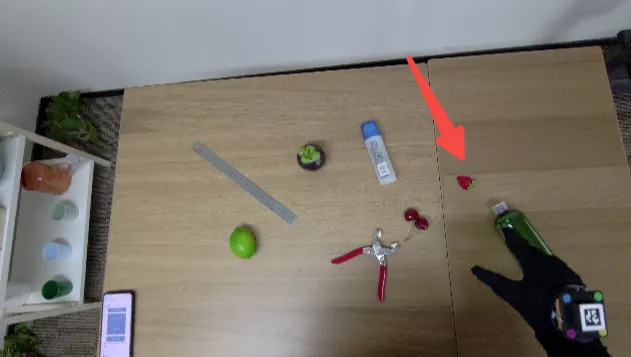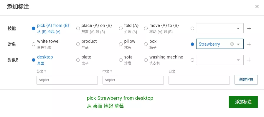 After pressing the R key, choose to add a label. Since this video shows picking up a strawberry from the desktop, the label is: "pick the strawberry from the desktop".