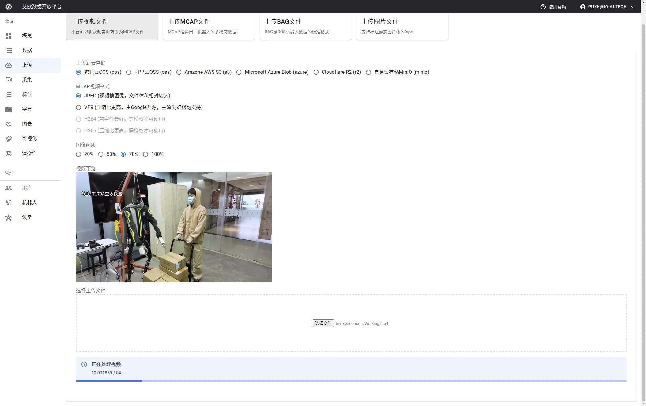 上传视频文件:平台支持在线将视频转换成Mcap格式: