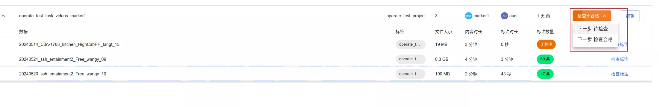 如果需要标注人员重新标注和修改的,选择检查不合格,重新回退至标注同学的任务列表里;不需要修改和重新标注,选择检查合格